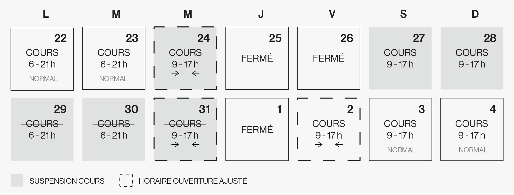 Suspension des cours collectifs : du 24 décembre au 1er janvier inclusivement.